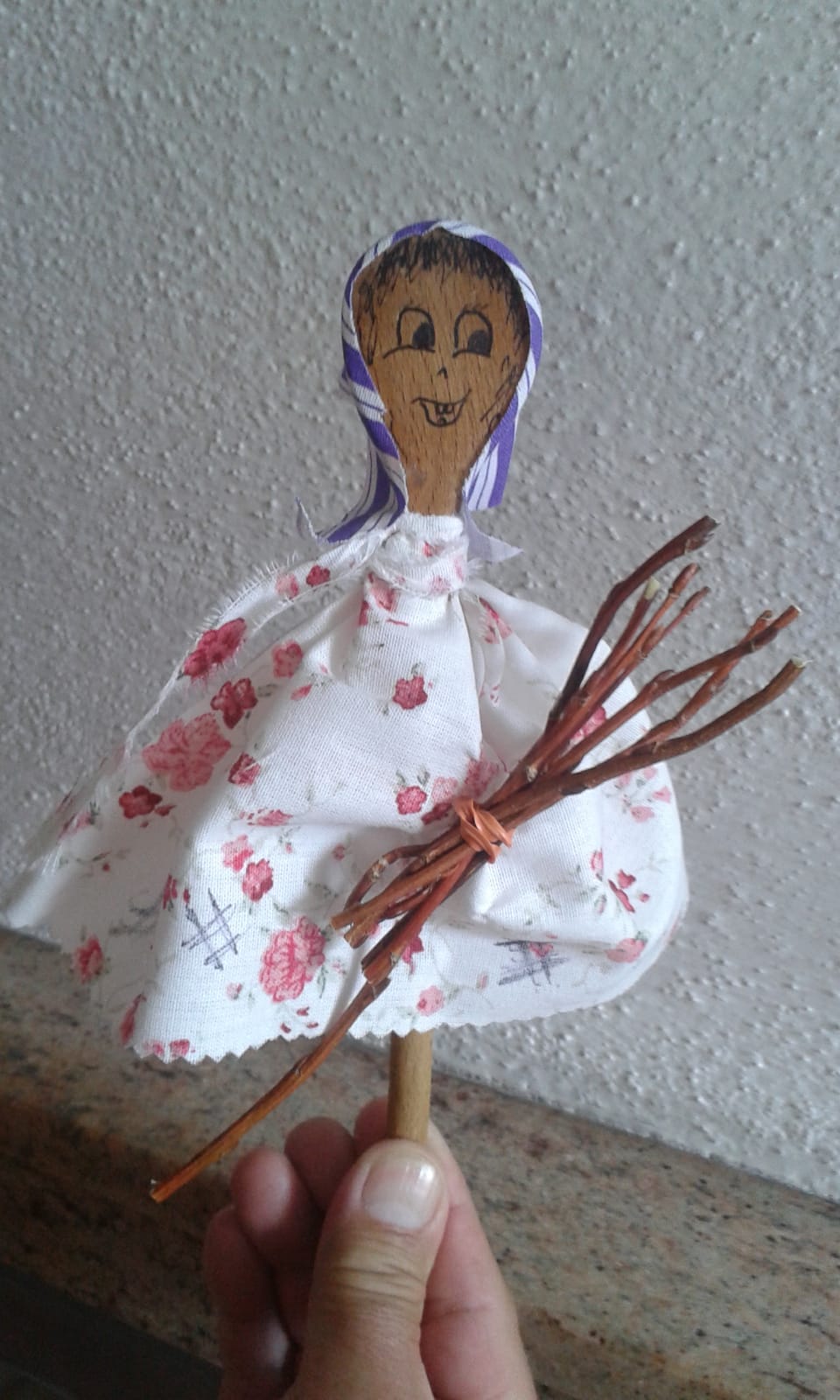 6. z klacíčku si můžeme vyrobit košťátko a svážeme drátkem, propíchneme konci drátku a připevníme